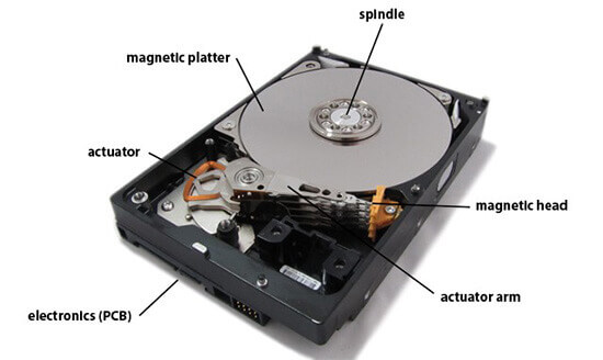 All hard drives are mechanical devices. They have a motor that spins metal disks called platters that store your data, read/write heads that read and write the data to one or both sides of each platter surface using electro magnetic technology, firmware that controls how the data is stored and organized between the platters and a circuit board (PCB) that provides power, a key part of the firmware and a connection interface to the computer.