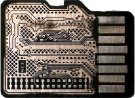 Monolithic camera card technology is the newest camera card technology on the market and is becoming more popular all the time. Monolithic camera cards are a single chip design camera card molded in solid plastic. This design has created many problems for data recovery companies because of the molded plastic that encases the camera cards electronics. The picture below shows the monolithic camera card with the plastic carefully scraped away to reveal the electrical track that we use to gain direct access to the data of a failed monolithic camera card. All Micro SD cards are monolithic and about 40% of the regular SD cards are monolithic.